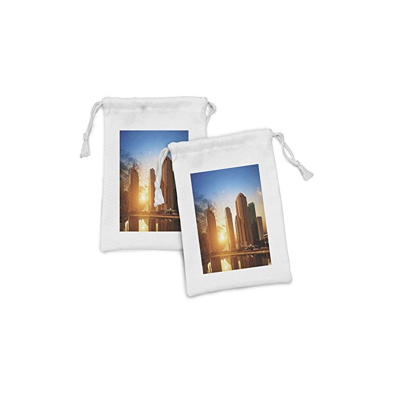 Lunarable City Fabric Pouch Set of 2, Skyscrapers of Shanghai Skyline with Dusk at Sunset Time Urban Scenery, Small Drawstring Bag for Toiletries Masks and Favors, 9" x 6", Orange and Blue