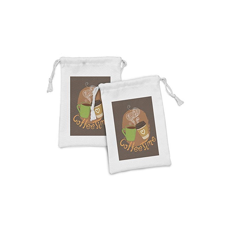 Lunarable Coffee Lover Fabric Pouch Set of 2, Coffee Time Lettering with Mugs Mocha Espresso Cozy Modern Graphic, Small Drawstring Bag for Toiletries Masks and Favors, 9" x 6", Umber Cinnamon Green