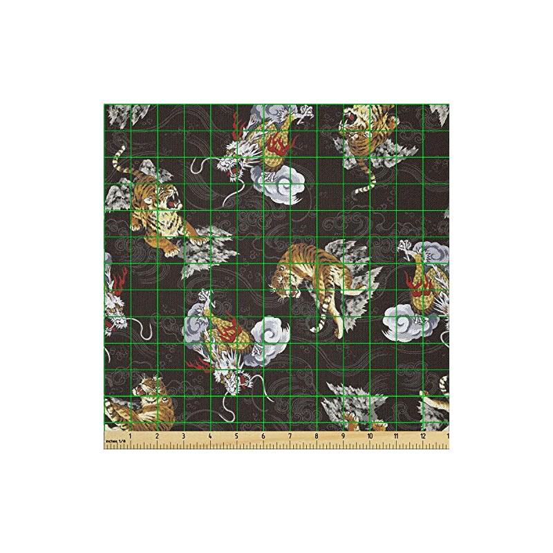 Lunarable Dragon Fabric by The Yard, Ferocious Fantasy Dragon and Tiger Between Smokes and Black Background, Microfiber Fabric for Arts and Crafts Textiles & Decor, 1 Yard, Pale Coffee Red Black