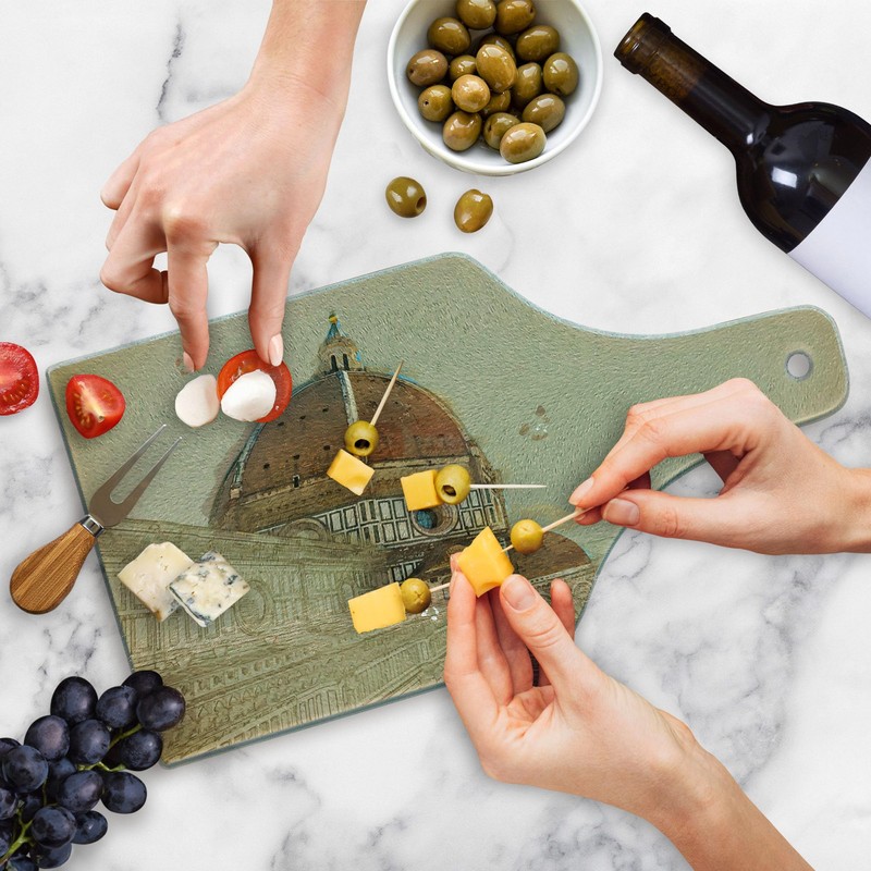 Lunarable Florence Cutting Board, Fine Art Panorama Scene Image with Architectural Building, Decorative Tempered Glass Cutting and Serving Board, Wine Bottle Shape, Pale Sepia Pale Redwood Taupe Beige