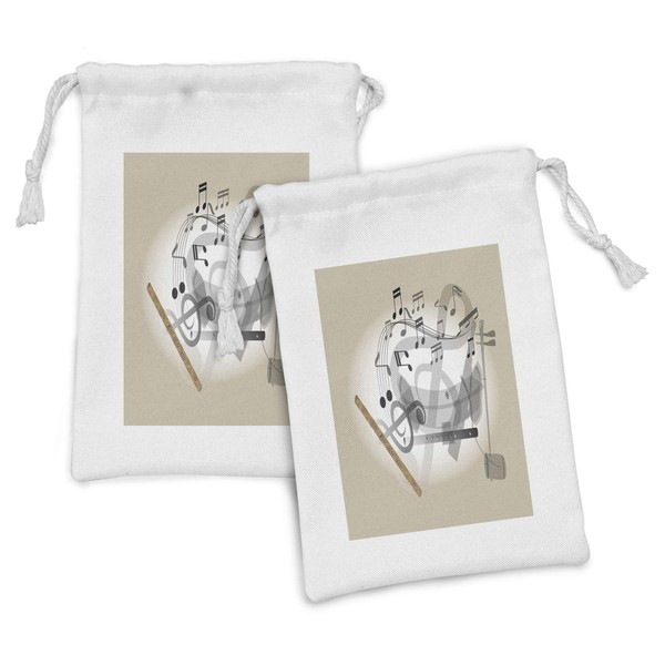 Lunarable Flute Pattern Fabric Pouch Set of 2, Folk Themed Thailand Instrument Harmony Music and Culture Print, Small Drawstring Bag for Toiletries Masks and Favors, 9" x 6", Pale Grey and Beige