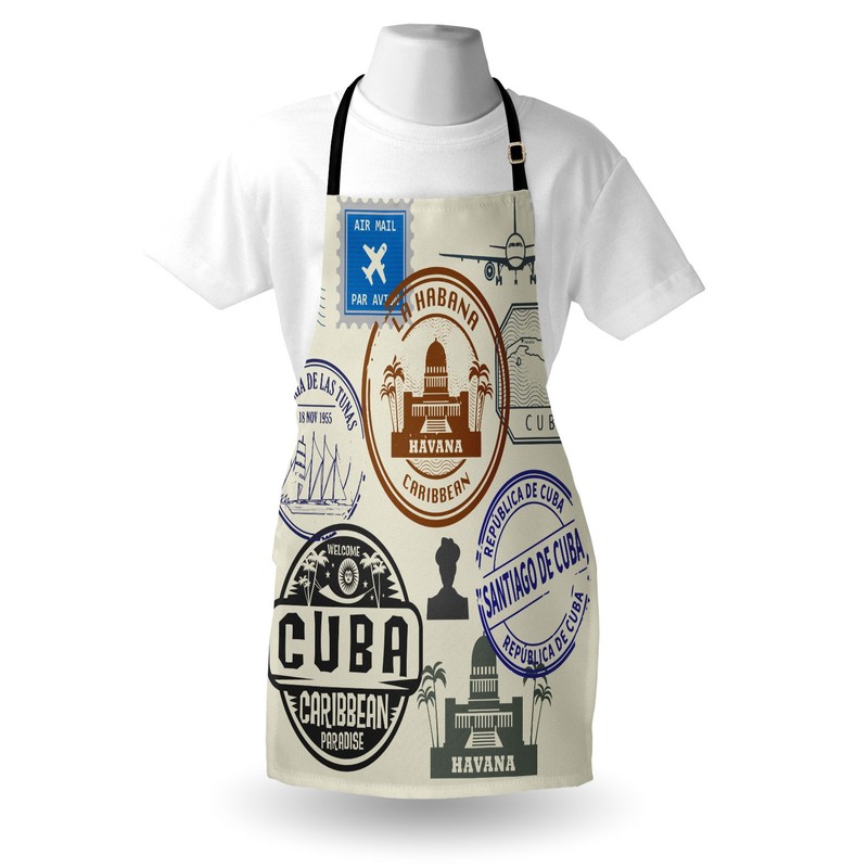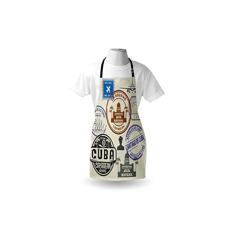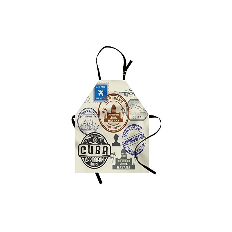 Lunarable Havana Apron, Travel Concept Passport Stamp Design of Cuban Cities and Landmarks, Unisex Kitchen Bib with Adjustable Neck for Cooking Gardening, Adult Size, Cobalt Blue