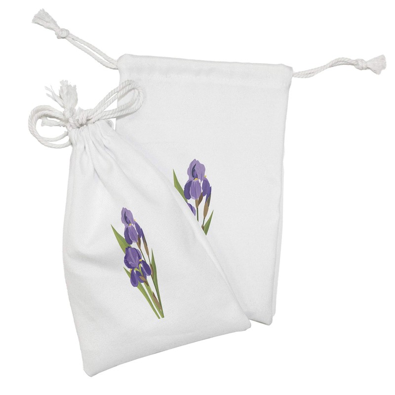 Lunarable Iris Flower Fabric Pouch Set of 2, Simplistic Illustration of Burgeoning Flowers with Olive Green Leaves, Small Drawstring Bag for Toiletries Masks and Favors, 9" x 6", White Blue Violet