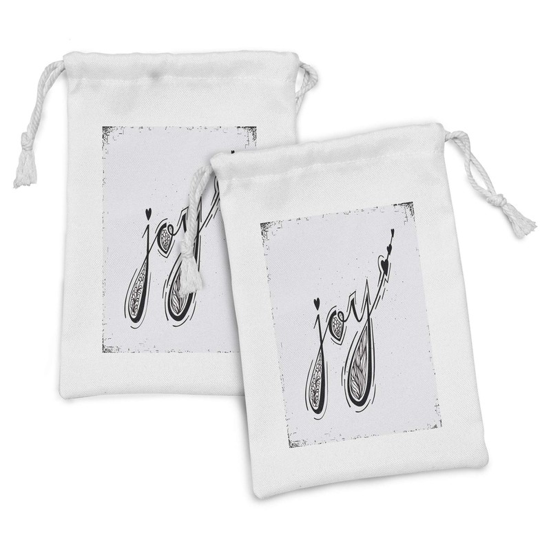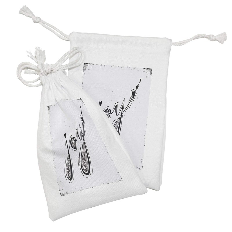 Lunarable JOY Fabric Pouch Set of 2, Typographic Design of Joy Word with Floral Hearts and Arrow Shapes Theme, Small Drawstring Bag for Toiletries Masks and Favors, 9" x 6", Black and White