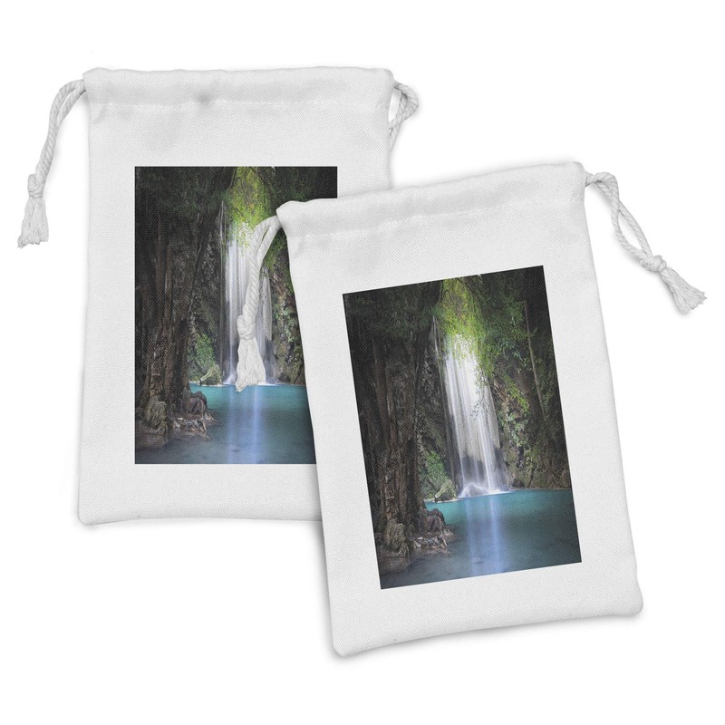 Lunarable Nature Fabric Pouch Set of 2, Surreal Scene Deep down in Rainforest with Waterfall Idyllic Image, Small Drawstring Bag for Toiletries Masks and Favors, 9" x 6", Fern Green Turquoise