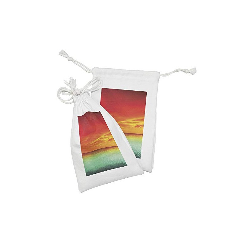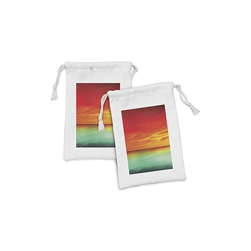 Lunarable Ocean Fabric Pouch Set of 2, Sunset Sea Holiday Destinations Horizon Peaceful Romantic Seascape View, Small Drawstring Bag for Toiletries Masks and Favors, 9" x 6", Red Orange Mint Green