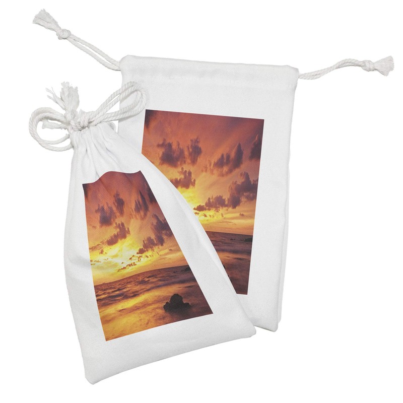 Lunarable Ocean Fabric Pouch Set of 2, Tropical Sunset at Rocky Beach Thailand Wavy Sea and Cloudy Sky, Small Drawstring Bag for Toiletries Masks and Favors, 9" x 6", Dark Orange Yellow