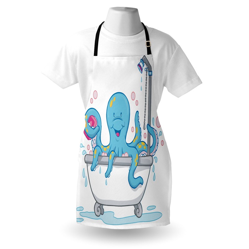 Lunarable Octopus Apron, Cartoon Illustration of Octopus Taking Bubble Bath Tub with Soap in Tentacles, Unisex Kitchen Bib Apron with Adjustable Neck for Cooking Baking Gardening, White Blue