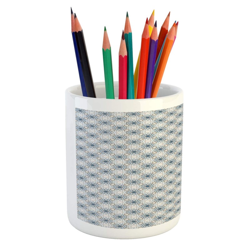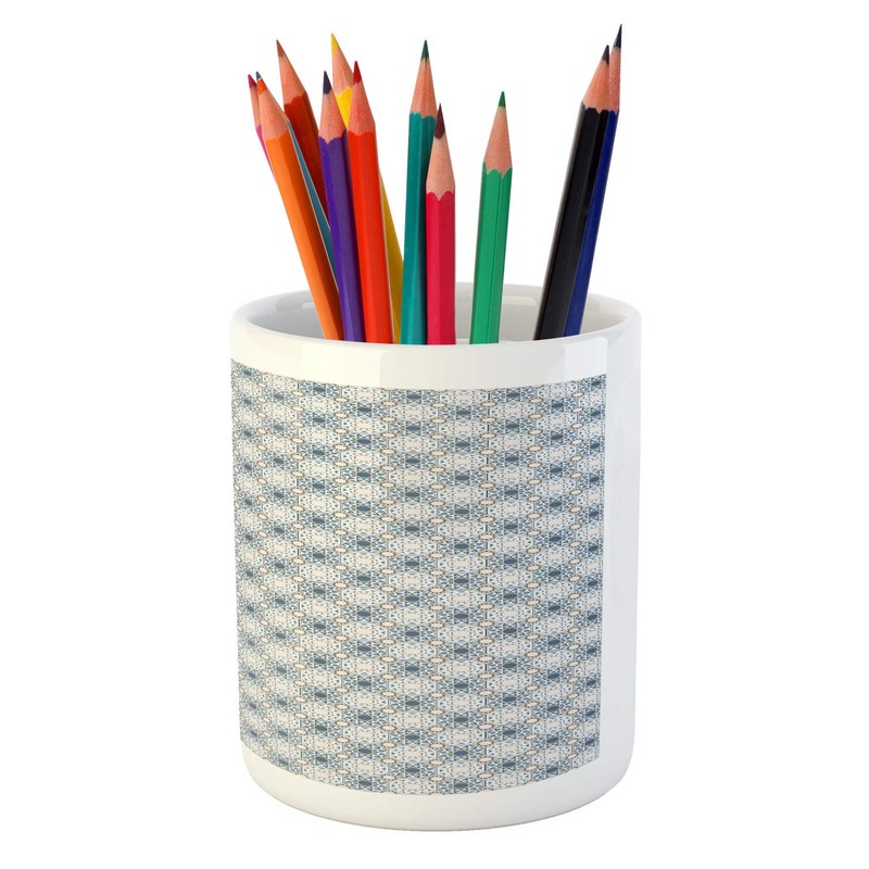 Lunarable Orient Pencil Pen Holder, Traditional Eastern Vibes Geometric Motifs, Ceramic Pencil Holder for Desk Office Accessory, 3.6" X 3.2", Slate Blue Pearl