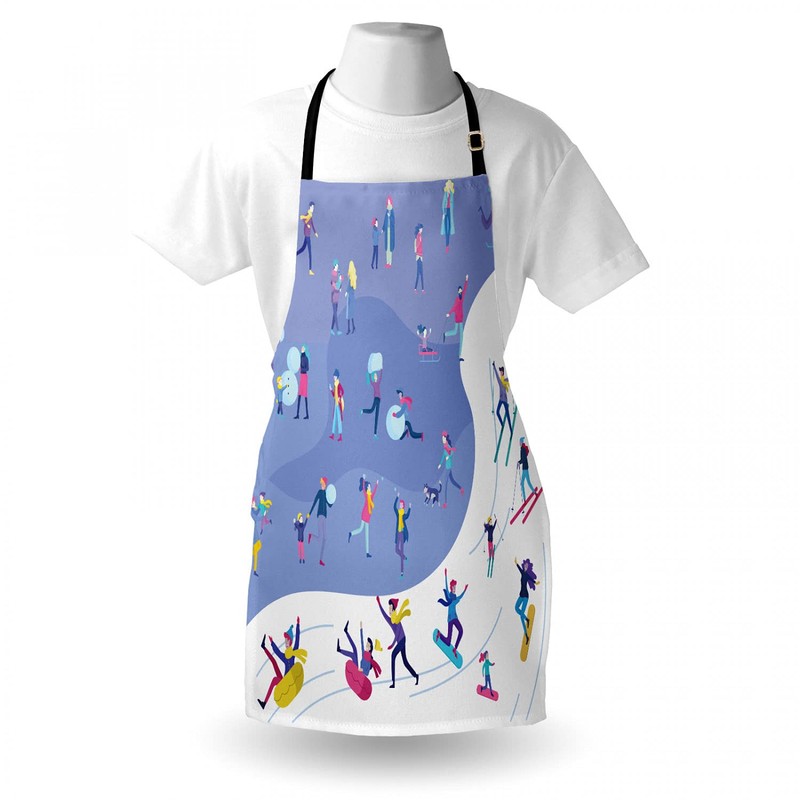 Lunarable Skiing Apron, Modern Colorful People Drawings Sledding Snowboarding Building Snowman, Unisex Kitchen Bib with Adjustable Neck for Cooking Gardening, Adult Size, Lavender Blue Multicolor