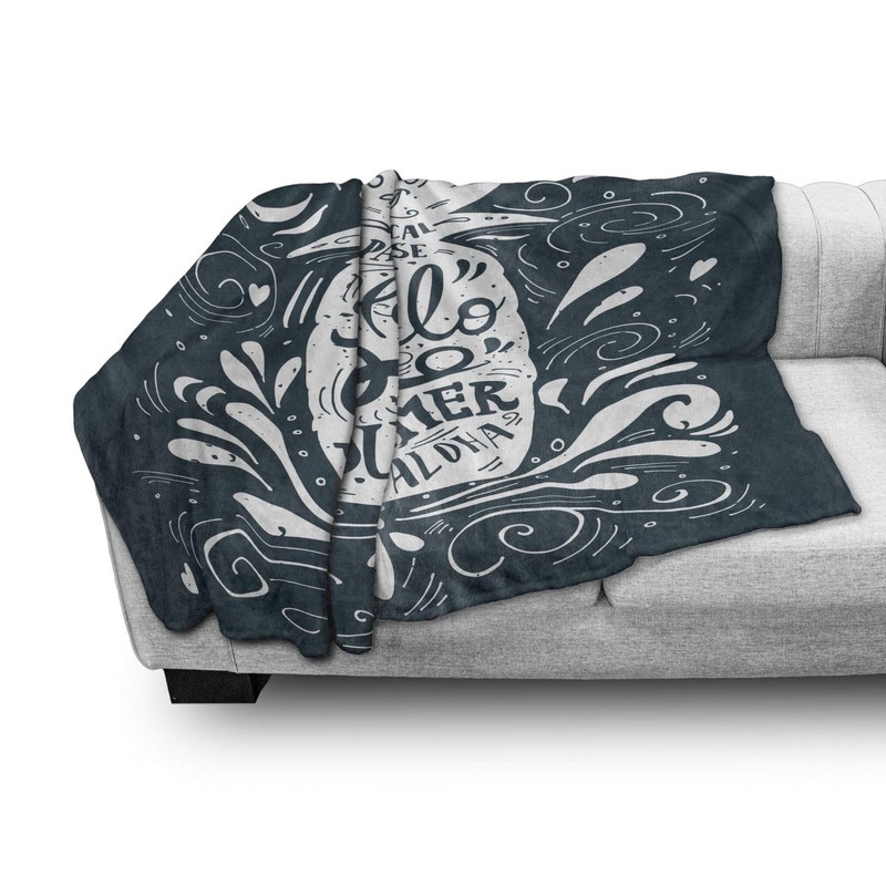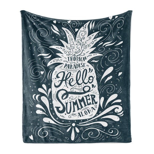 Lunarable Summer Throw Blanket, Print Hello Aloha a Pineapple Summertime Tropic Exotic Warm Season Weather, Flannel Fleece Accent Piece Soft Couch Cover for Adults, 50" x 60", White and Black