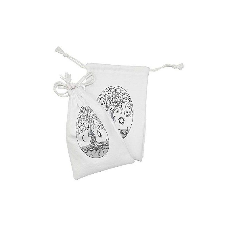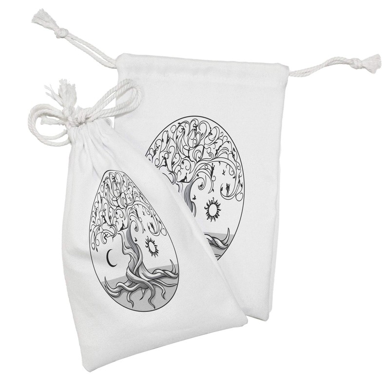 Lunarable Sun and Moon Fabric Pouch Set of 2, Life Tree with Swirling Branches and Angels, Small Drawstring Bag for Toiletries Masks and Favors, 9" x 6", Pale Grey White