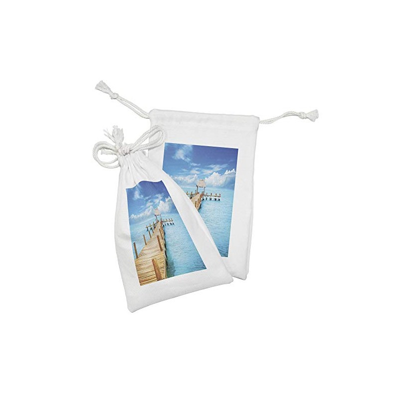 Lunarable Tropical Fabric Pouch Set of 2, Bungalow on Clear Sea Travel Destination Beach Seascape Exotic View, Small Drawstring Bag for Toiletries Masks and Favors, 9" x 6", Pale Brown Blue Aqua