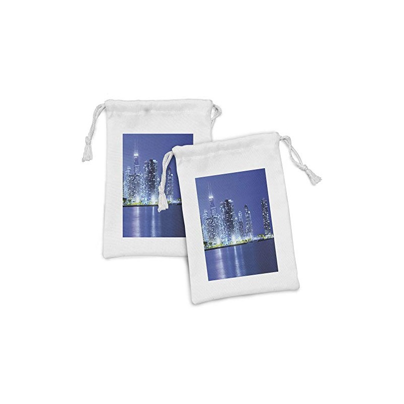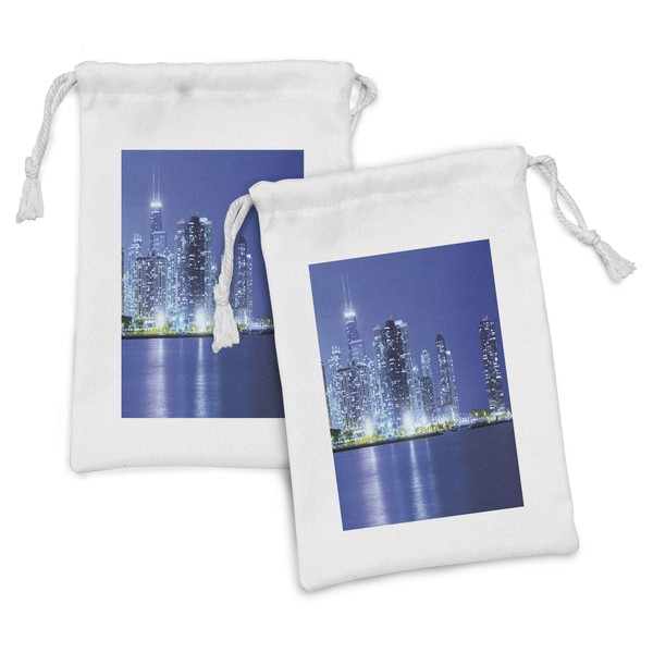 Lunarable Urban Fabric Pouch Set of 2, Chicago City Night Financial District Skyscrapers Buildings Downtown Panorama, Small Drawstring Bag for Toiletries Masks and Favors, 9" x 6", Violet Blue Grey