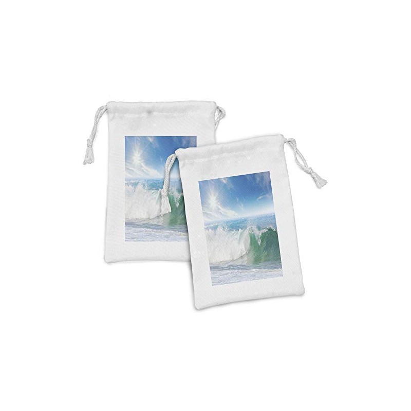 Lunarable Wave Fabric Pouch Set of 2, Summer Vacation Theme Seascape with Wave and Clear Sky Travel Surf, Small Drawstring Bag for Toiletries Masks and Favors, 9" x 6", Fern Green Pale Blue