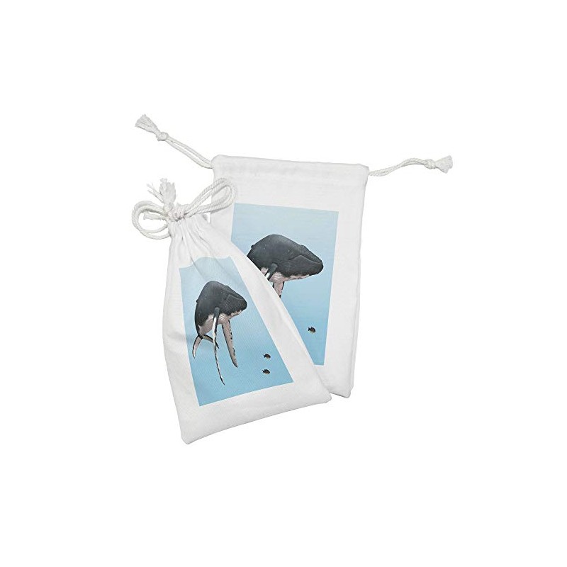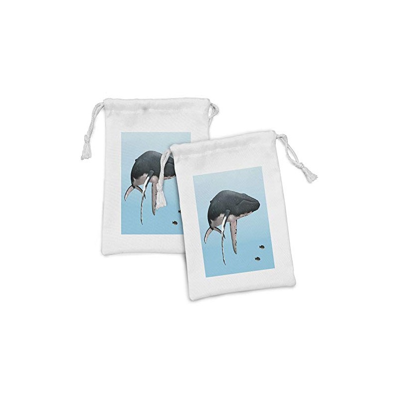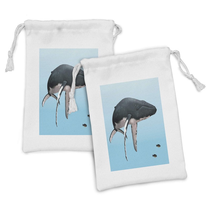 Lunarable Whale Fabric Pouch Set of 2, Giant Humpback Whale Swimming with Little Fishes Marine Aquatic Scenery, Small Drawstring Bag for Toiletries Masks and Favors, 9" x 6", Dark Blue Grey Pale Blue