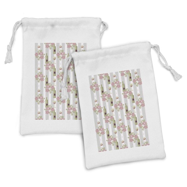 Lunarable Winery Fabric Pouch Set of 2, Floral Pattern Bottles of Wine and Glasses on Striped Background Leaves, Small Drawstring Bag for Toiletries Masks and Favors, 9" x 6", Rose Pale Green White