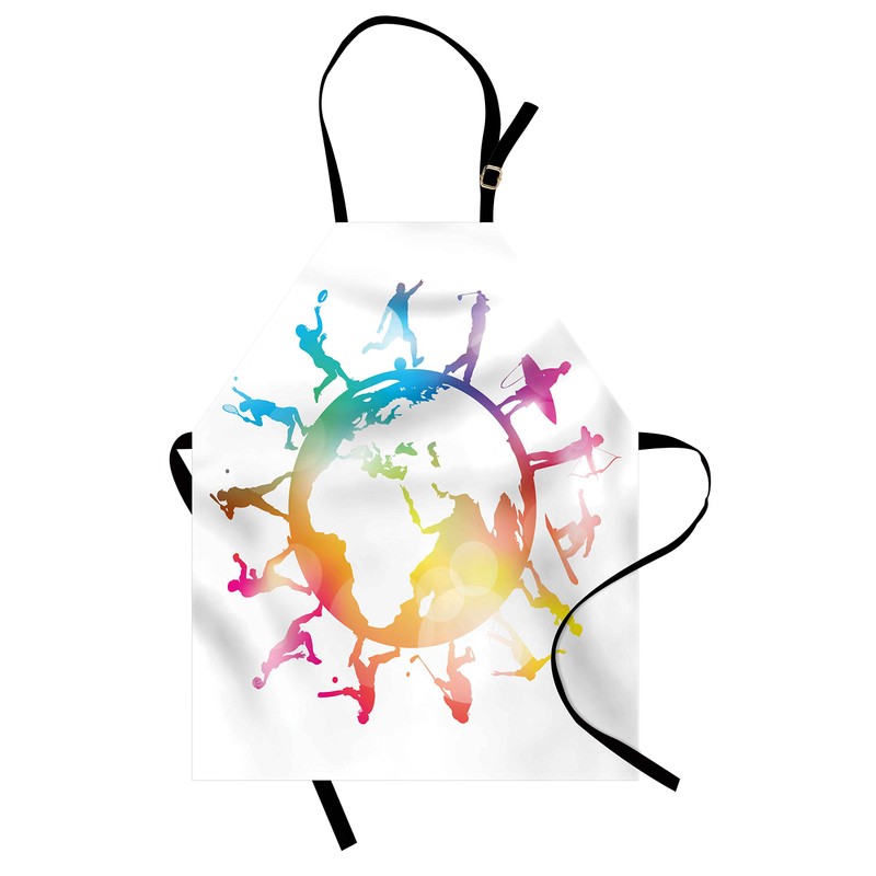 Lunarable World Map Apron, Golf Football Baseball Archery Basketball Players on Globe Picture, Small Apron Bib with Adjustable Ties for Baking Painting, Small Size, Pink Orange Pale Blue