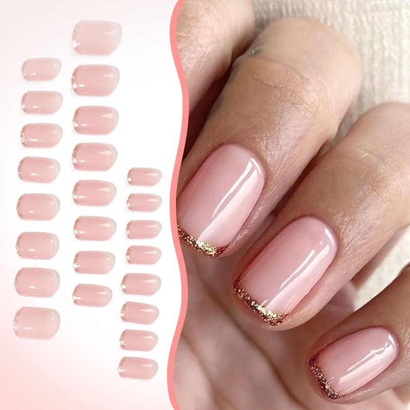 LunarCharm 24 Pieces Short Square Press-On Nails, Pink False Nails with French Tips and Glitter Designs Featuring Golden Edges, Short Thick Natural Press-On Nails