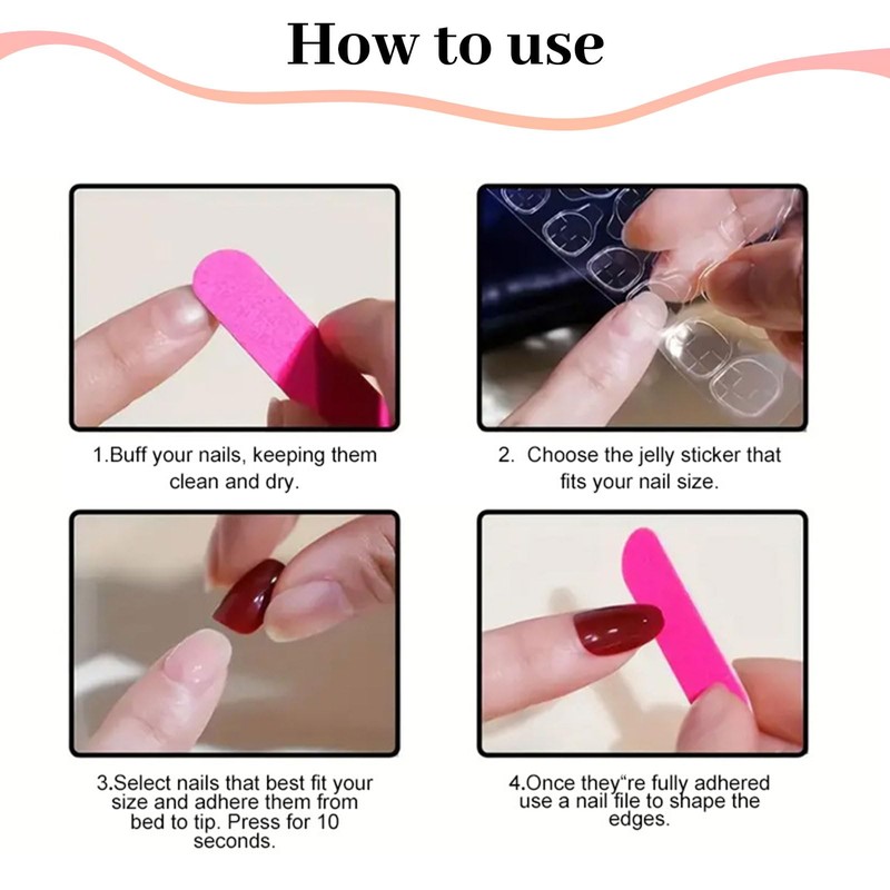 - Dauerhafte Wirkung: Sie können den Nagelkleberaufkleber verwenden, den wir verschenken (verwenden Sie Nagelkleberaufkleber, quadratische künstliche Nägel können wiederverwendet werden), aber der Nagelkleberaufkleber ist nicht so gut wie flüssiger Kleber. Wenn Sie ihn länger halten möchten, verwenden Sie bitte flüssigen Kleber. Die Wirkung kann 1 bis 2 Wochen anhalten.