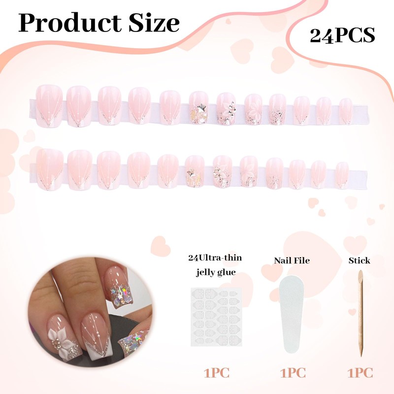 - Verpackung beinhaltet: Sie erhalten 24 künstliche Nägel, 24 Gelee-Kleber, einen kleinen Holzstab und eine Nagelfeile. Es sind keine zusätzlichen Werkzeuge erforderlich.