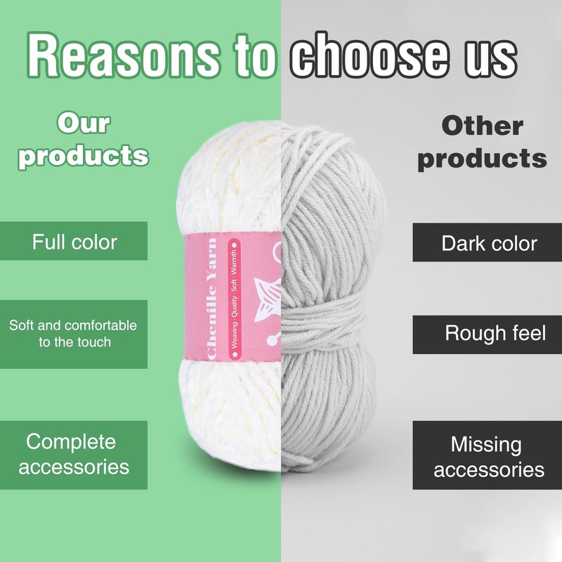 - Chenille Knitting Yarn Set: This chenille knitting yarn set includes 3 skeins yarn, 10pcs stitch marker clip, 10pcs open stitch marker ring (S/ M), 6pcs plastic large eye needles (7/9/15cm), 4pcs blunt large eye needles (6/7cm), 2pcs curved needles (7/8cm).