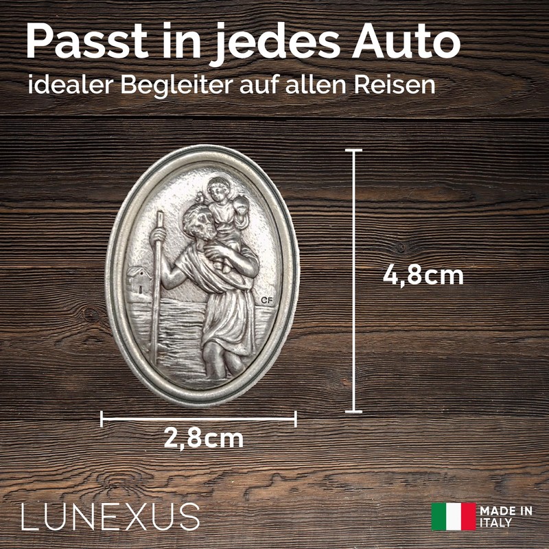 - Patron saint of motorists - traditional Christian symbol for safety on the go: Saint Christopher is the patron saint of all those who travel a lot. This car plaque is reminiscent of the spiritual meaning of this saint and accompanies motorists, commuters and frequent drivers on all paths. The detailed metal embossing depicts Christopher with the Christ Child and symbolises protection and blessing when travelling. Whether in the car, motorcycle or motorhome, this blessed plaque is a meaningful symbol of protection for anyone who wants spiritual support in road traffic or on long journeys.