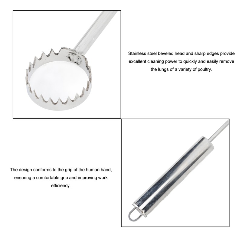 1、Ergonomic Design: Our stainless steel lung remover is designed to fit the human grip, minimizing slippage and increasing efficiency, maintaining a comfortable grip regardless of prolonged use or heavy duty tasks. 2、Easy to Clean: Stainless steel makes cleaning a breeze, just wipe with soap and water, maintaining your cleanliness and hygiene becomes easier. 3、Multiple Uses: Our lung remover is suitable for quickly and easily removing the lungs of a wide range of poultry, including chickens, turkeys, ducks, geese, highland birds and more. It's a versatile tool for your different needs when cooking and preparing food. 4、Save Time and Energy: Our lung scraper are designed to quickly remove the lungs from poultry, saving you valuable time and energy. Reducing tedious manual operations allows you to focus more on other cooking steps and increase efficiency. 5、Durable Material: This chicken processing equipment is made of stainless steel, allowing for long term repeated use, providing you with a pleasant experience for years to come.