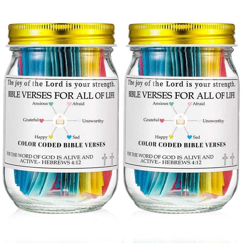 - Color Coded Design: our Christman prayer jars offer a unique feature with the color coded design of the verse cards; Each color represents a different emotion, green for gratitude, pink for anger, yellow for happiness, light blue for anxiety, red for loneliness, and dark blue for sadness, allowing you to choose your daily dose of bible verse by the color that relates to your current mood or emotional state