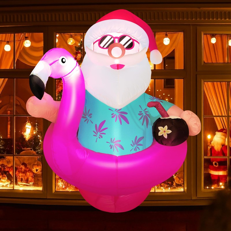 - Eye Catching Design: this charming inflatable decoration brings the joy of tropical Christmas to your home, adorned with a happy santa claus in holiday clothes, wearing sunglasses and a Hawaiian shirt with a flamingo swim ring, holding a coconut in hand, blending classic Christmas joy and warm island atmosphere
