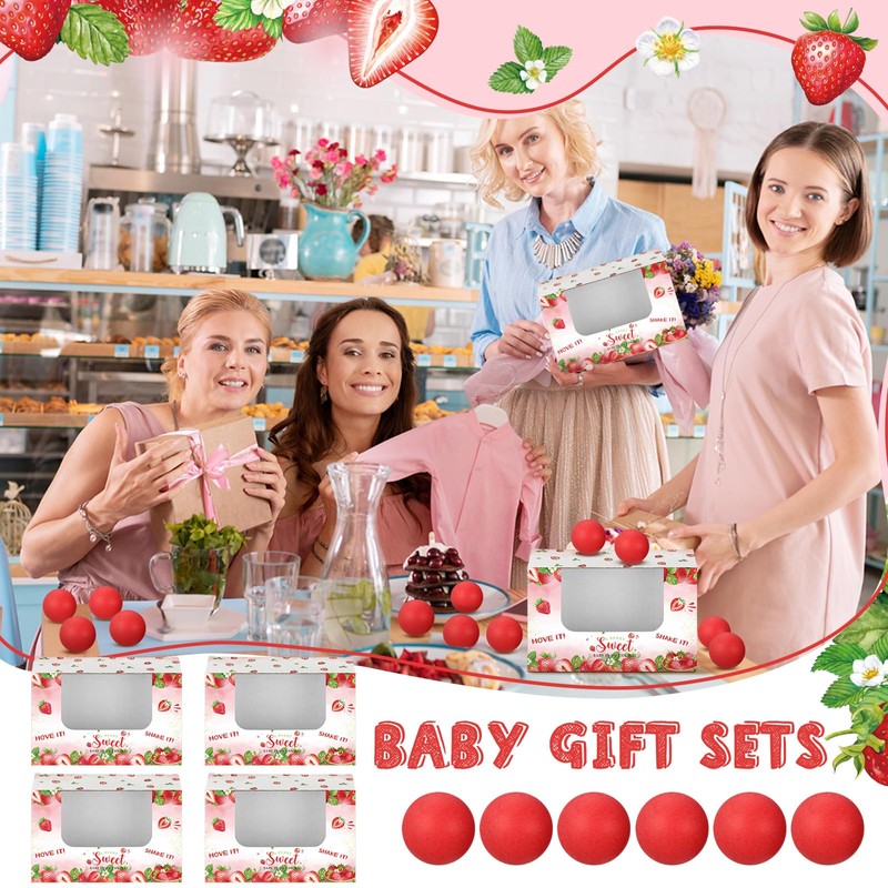 - Set Includes: 40 red plastic ball, 4 ribbon, 4 corrugated cardboard box; Designed for four players, each equipped with a box tied around their hips filled with red plastic balls; Twerk it, win it; This strawberry baby shower game puts your twerking skills to the test