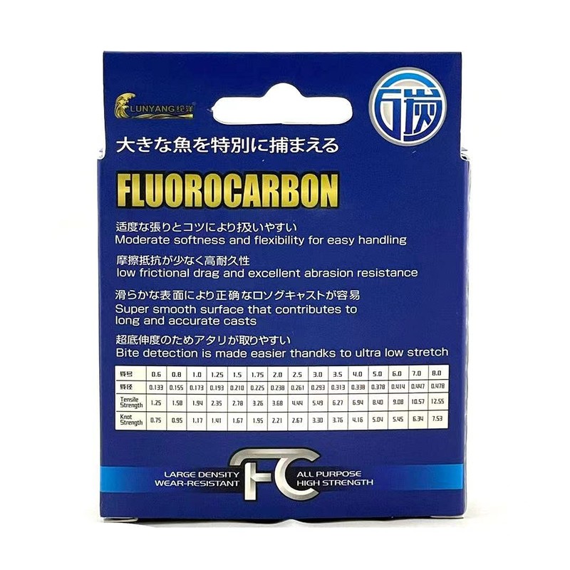 纶洋フルオロカーボンライン(フロロカーボン)は主に海釣りのショックリーダー(リーダー)として使用でき、競技にも使用し、又一般的な釣りにも適してます。他の材質のラインと比較すると特徴は次の通りです。