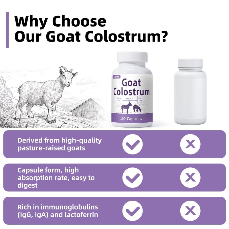 Looking for a natural way to enhance your immunity, support gut health, and boost athletic performance?Goat milk offers a nutrient-packed alternative to cow milk and is a gentle option for those with sensitivities or allergies to cow or camel milk.Why choose our goat colostrum supplement capsules?Nutrient-Rich & Effective: Sourced from grass-fed goats, these capsules are packed with immunoglobulins and high-quality whey protein, helping to improve digestion, promote gut health, and strengthen your immune system.Ideal for All Ages: Whether you're an athlete aiming to improve endurance and recovery, or someone seeking better digestive health, our grass fed milk are designed to support your needs.Convenient 1-Month Supply: With 100 capsules per bottle, simply take 3 capsules daily1 hour before or 2 hours after meals. These gluten-free capsules are perfect for those with dietary sensitivities or lactose intolerance.Choose goat milk colostrum supplement for a natural, effective boost to your overall health. Ideal for athletes, health-conscious individuals, and anyone looking to maintain a strong immune system and digestive function.