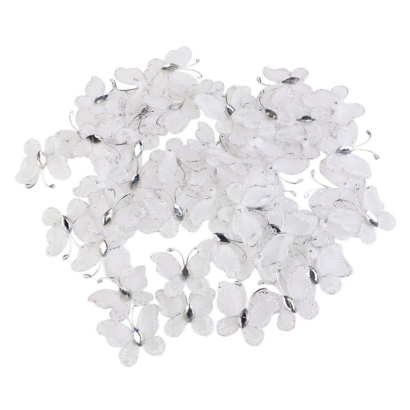 LUOEM Pack of 50 Glitter Butterflies Artificial Butterflies Jewellery for Weddings Sheer Mesh Wire Gem White, Mesh fabric, gem and wire