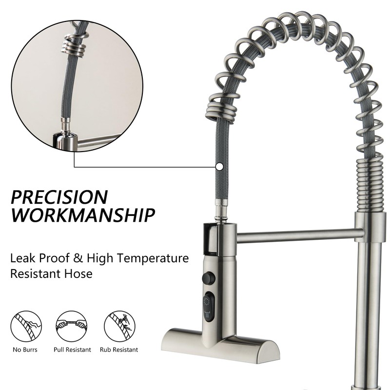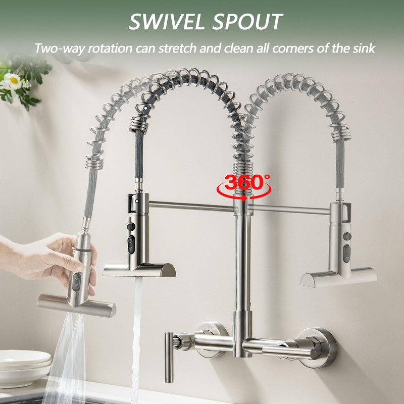 - 【360°Cleaning Freedom】The wall mount faucet 8 inch center has a 360° swivel pull-down sprayer that cleans every corner of the kitchen sink.high arc spring faucet with leakproof and heat-resistant hose ensures long term high performance, prevents leaks and is durable.