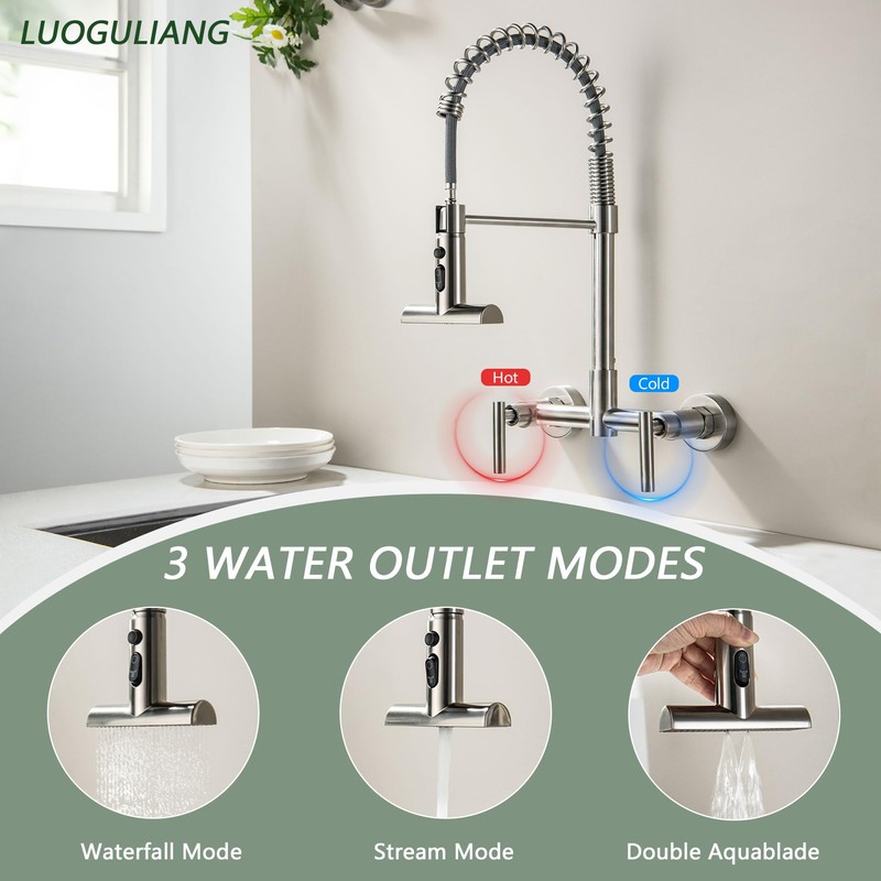 - 【3 Functions Sprayer】The Wall mount kitchen faucet with sprayer features a unique waterfall sprayer with a waterfall for gentle rinsing without splashing. And it features 3 modes-waterfall,water stream,and dual water blades.Perfect for rinsing dishes, washing vegetables, or cleaning larger containers with ease.