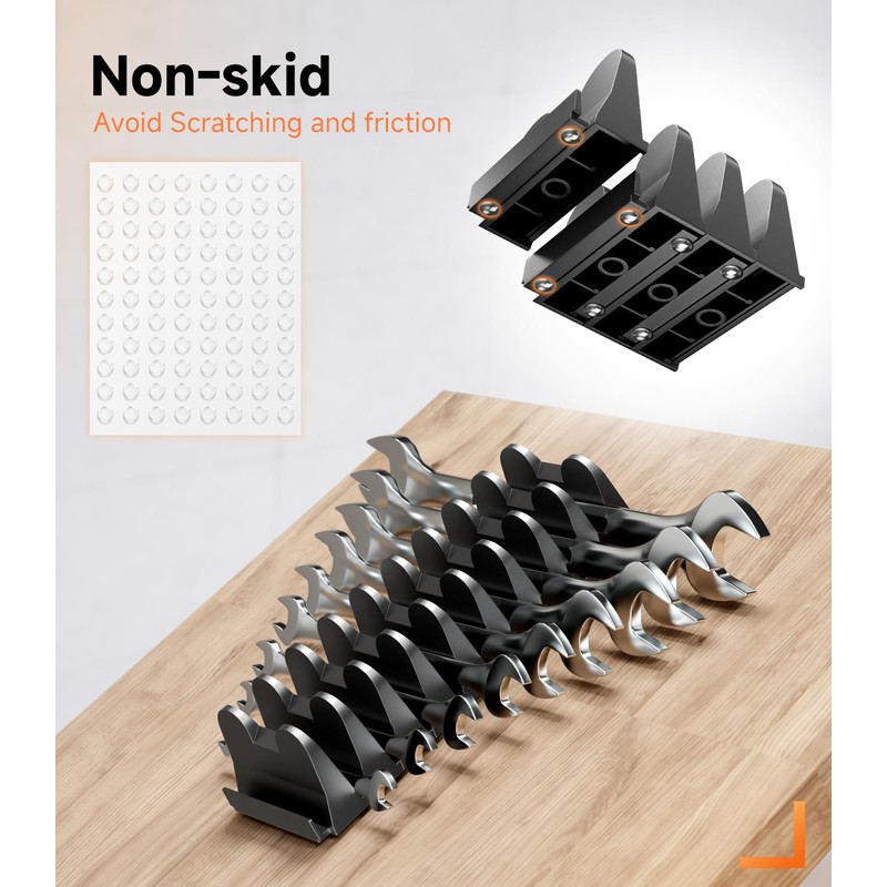 • Wrench Organizer Solution : The multifunctional wrench organizer is designed to store more wrench tools in a compact space, presenting your wrenches with orderly angles and consistent spacing, providing you with different solutions for customized wrench storage solutions