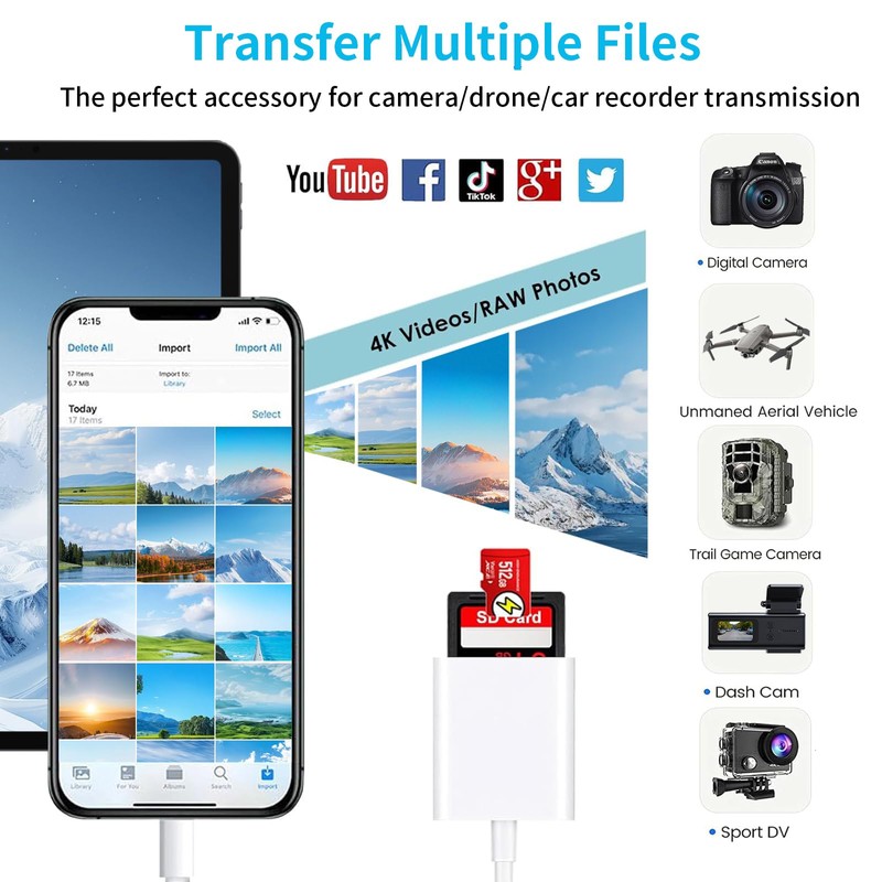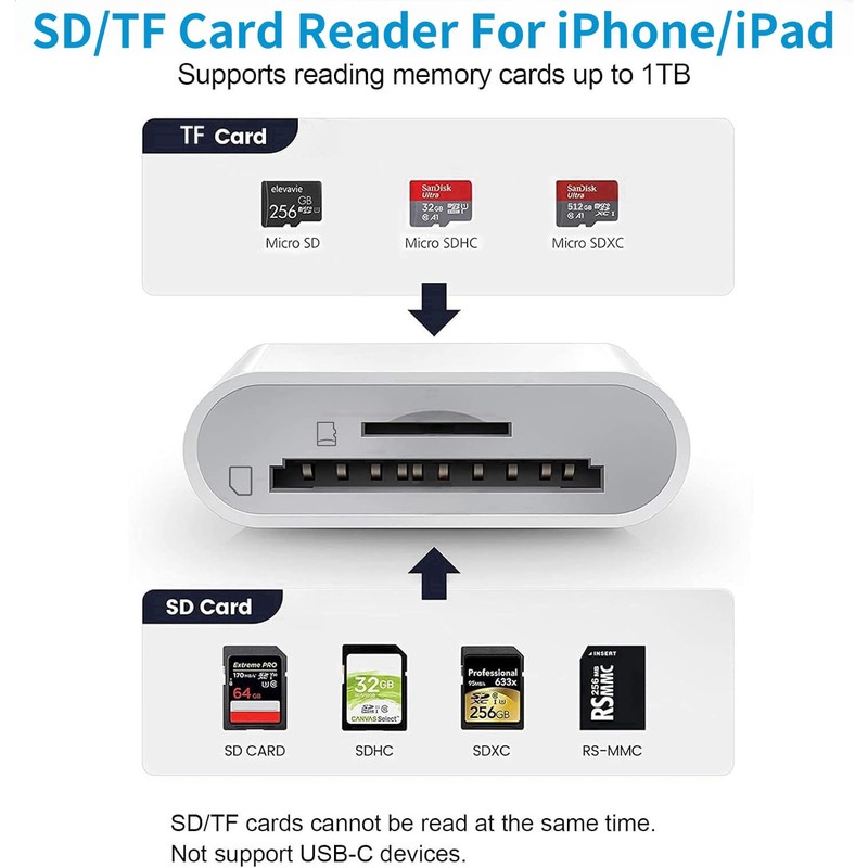 - Capacity and Format Support: The digita camera adapter to iphone supports the memory card with a maximum capacity of 1TB. Compatible with SD/SDHC/SDXC/MicroSD/MicroSDXC/MicroSDHC cards. Support standard photo formats (including JPER and RAW) and SD/HD video formats (H.264 and MPEG-4)