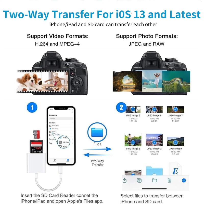 - Two-way Transfer: The Memory Card Reader for iPhone supports two-way to stable transfer files/photos/music/video, from SD card to iphone/ipad or form iphone/ipad to memory cards. (The SD card adapter for iphone supports iOS 13 and later