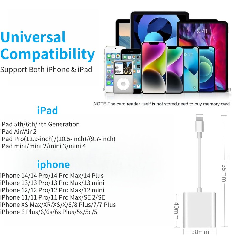 - Universal Compatibility: The iPhone SD card reader compatible with iPhone 14/14 Plus/14 Pro/14 Pro Max/13/13 mini/13 Pro/13 Pro Max/12/12 mini/12 Pro/12 Pro Max/11/11 Pro/XS/XS Max/XR/X/8/8 Plus/7/7 Plus/6s/6s Plus/6/6 Plus/SE/SE2 and iPad Air/Mini/ Pro etc