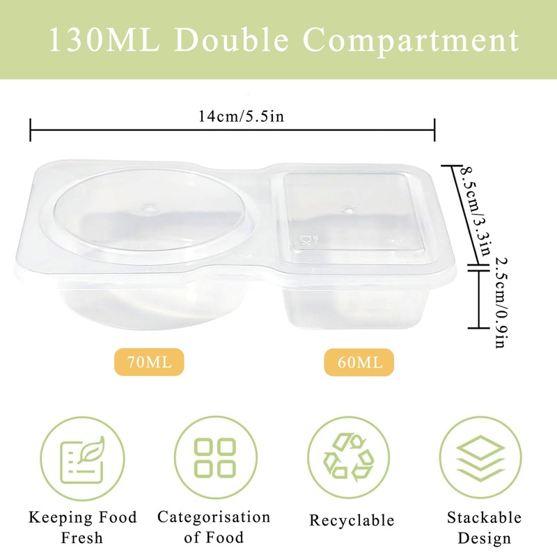 - 【Space-Saving & Portable Design】These double-layered snack containers with lids are stackable, offering an efficient space-saving solution for your storage needs. The round portion holds 70ML, while the square portion holds 60ML, ultra-lightweight and compact, these containers fit easily into bags, car cup holders, gym bags, or picnic baskets—providing convenience without the bulk.
