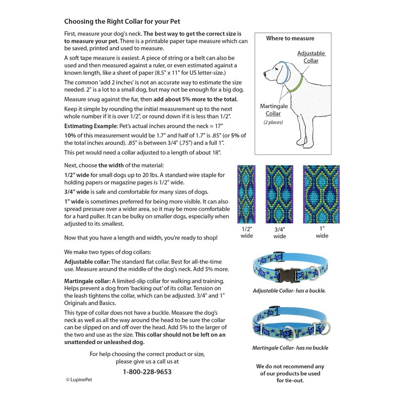 To determine collar size, measure snugly around the middle of the neck, then add an extra 5-percent for a comfortable fit. Also measure around the headÕs widest point, from under the jaw, over the top of the skull and back down to the start point. Be sure that the collar is large enough to go on over the head. There are two adjustable size ranges: 10-14 inches or 14-20 inches. 3/4-inch wide martingale collars are suitable for small to medium-large dogs.