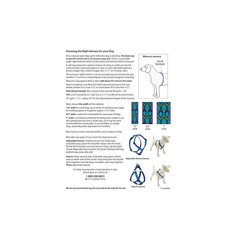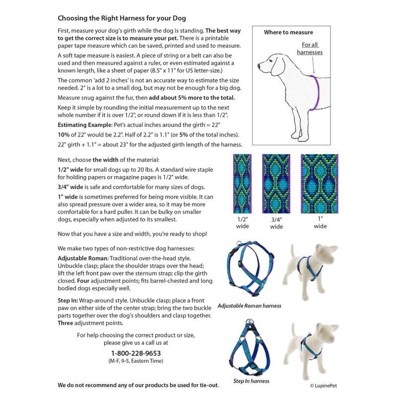 The 1-inch-wide Lupine Adjustable Step In harness is offered in two adjustable girth sizes: 19 to 28-inches and 24 to 38-inches. To choose the correct size always measure the dog around the body, just behind the front legs. Measure snugly, and then add an extra 5% to find the actual adjusted size of the harness girth. Or, measure the girth strap from the dog's current harness.