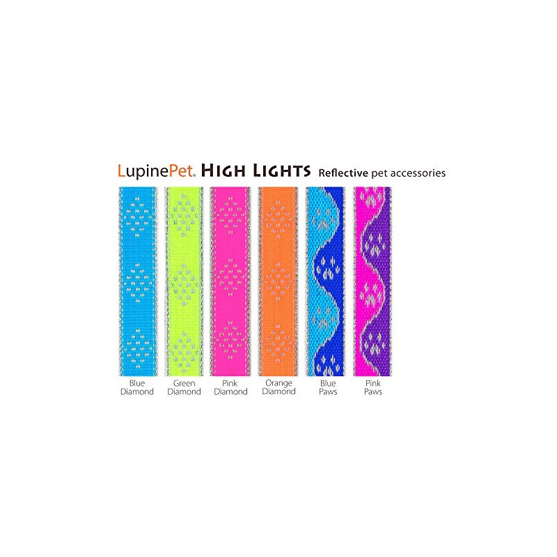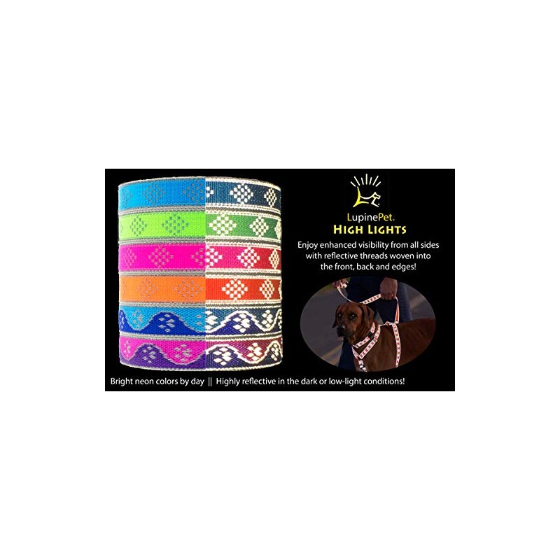 Lupine High Lights are available in 6 bright colors and three widths: 1/2", 3/4" and 1". High Lights are made from nylon with reflective threads woven into the front, back and edges for maximum visibility. The reflective threads bounce light back to an observer so that these products may be seen in low-light or dark conditions when light shines on them. Made with strong bar-tack stitching, welded steel hardware, and ends which are turned under and stitched to protect fur and skin. Matching leashes and collars are available.
