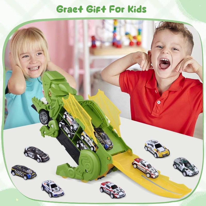 - 【Dual Transformation of Dinosaur & Slide】This dinosaur car play truck can be easily transformed by slightly moving the dinosaur's front and back claws to make it stand up. The side containers can be unfolded to serve as the dinosaur's wings, while the top container can be unfolded to serve as its tail, creating a cool and appealing look that children love. At this point, you can place the car on the dinosaur's back, and the opened containers will form a perfect slide, providing a variety of gameplay options.