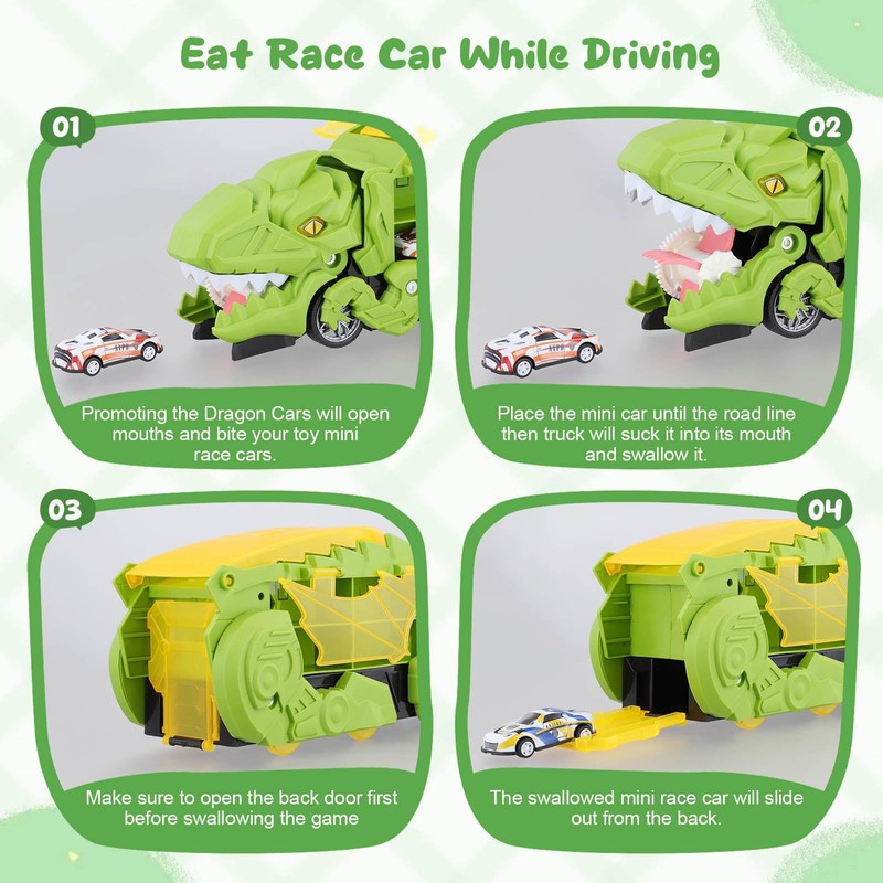 - 【Fun Dinosaur Feeding Gameplay】Our dinosaur truck toy offers an entertaining gameplay feature where the dinosaur can continuously "eat" the included alloy cars as it moves along. Children simply need to push the dinosaur truck forward, causing the dinosaur's mouth to open and close as it moves. When a car approaches the dinosaur, it can be "eaten" and swallowed. The car will then slide out from the back of the dinosaur as it continues to move, providing endless fun for kids.