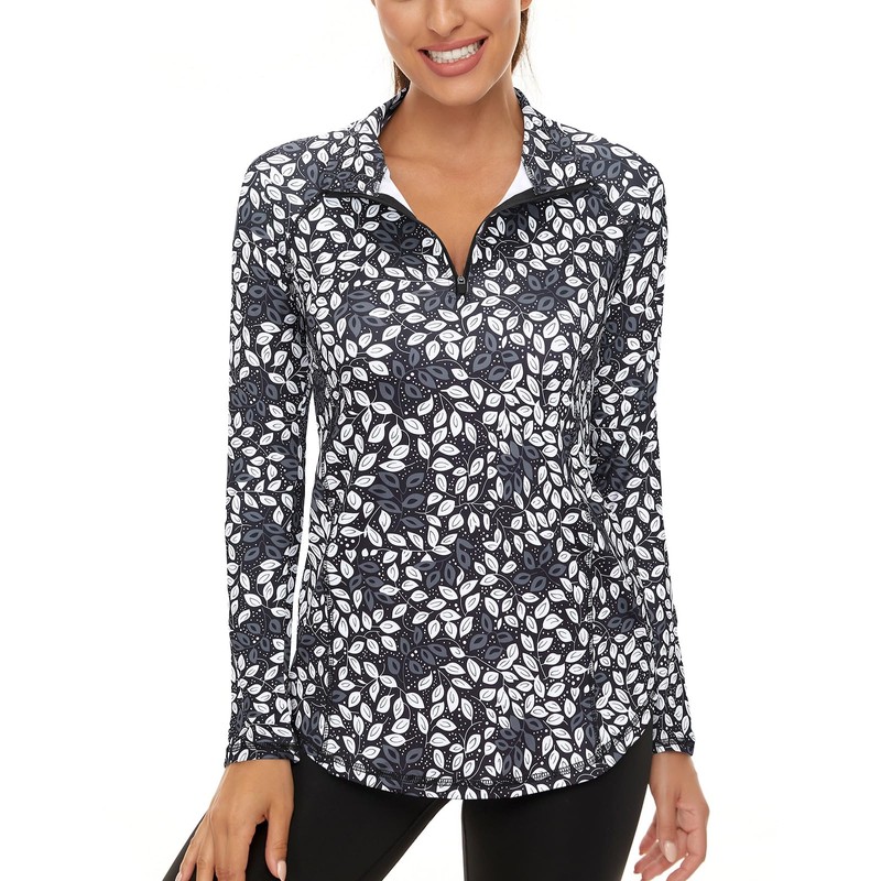LURANEE Long Sleeve Athletic Tops for Women,UPF 50+ Long Sleeve 1/4 Zip Pullover Athletic Hiking Running Workout Tops White Leaf Black M