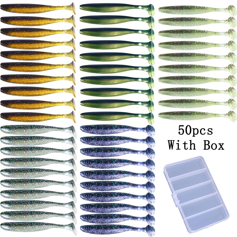 - 50 pcs Paddle Tail Swimbaits Set with box: 5 different colors, 10 pcs for each color. Length:1.97in, weight:0.042oz, package:50 pcs/box.Different colors can be selected according to different fish species, so that anglers have more choices and more flexible Soft Plastic Fishing Lures replacement.