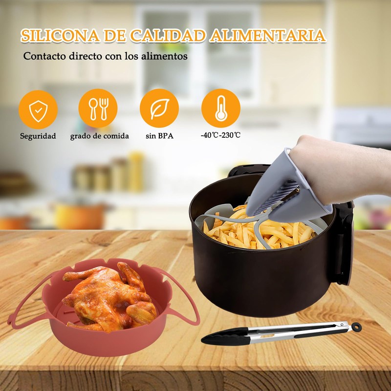 Juego de accesorios para freidora Cesta de silicona para freidora de aire* 2 (rojo y gris), clip para olla de silicona* 2 (gris), clip para alimentos* 1 (negro).