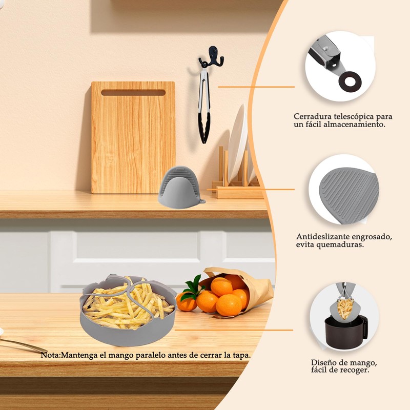 - 【Abrazadera de silicona para ollas】Clip de mano de silicona resistente a altas temperaturas, flexible y flexible. Hay texturas antideslizantes en el interior de los guantes, lo que los hace más seguros de usar. Diseño engrosado, eficaz anti-escaldado, perfectamente combinado con la molde de silicona para freidora de aire. El diseño del orificio para colgar hace que sea fácil de colgar y almacenar sin ocupar espacio.